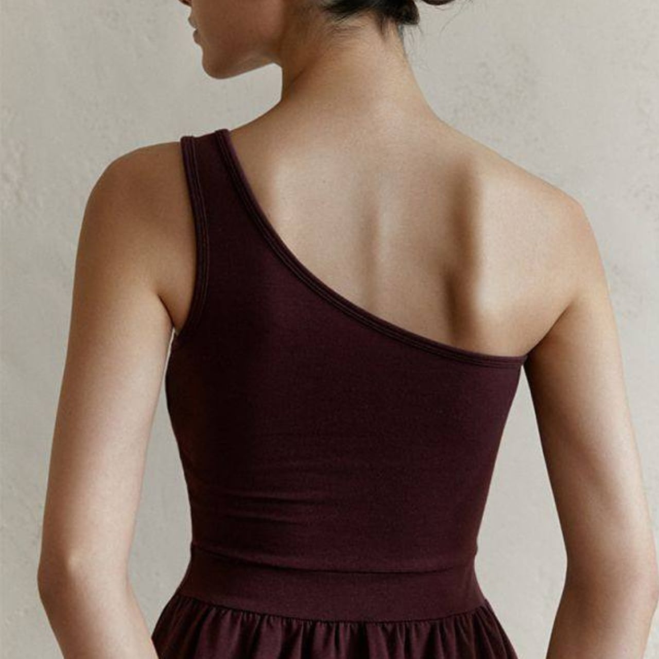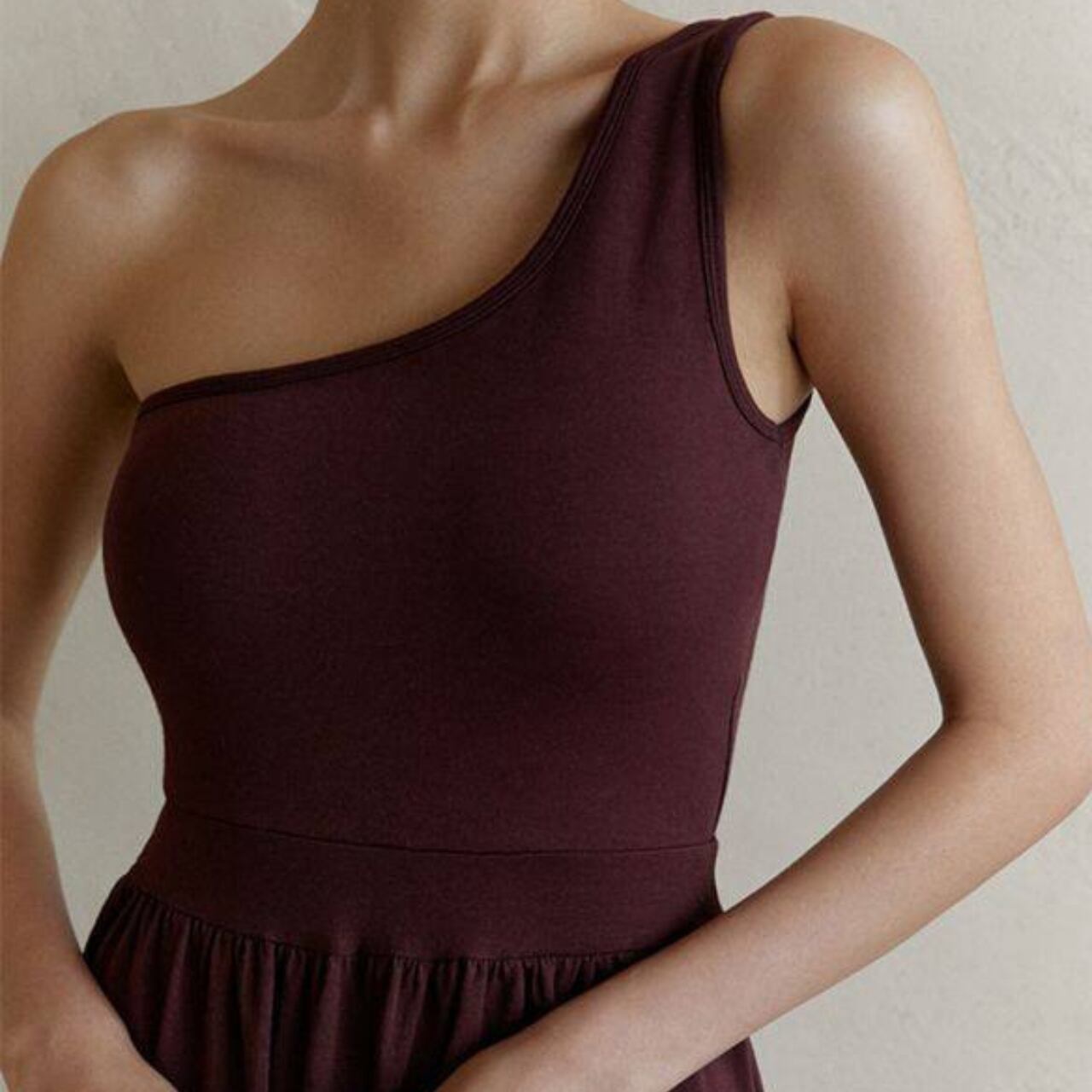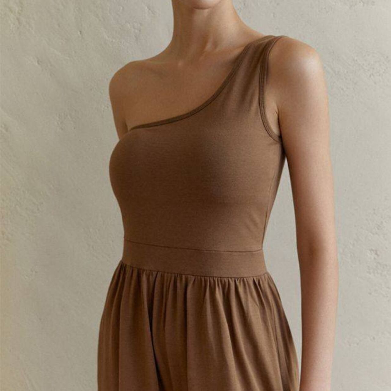 ワンショルダーのデザインは、肩周りを