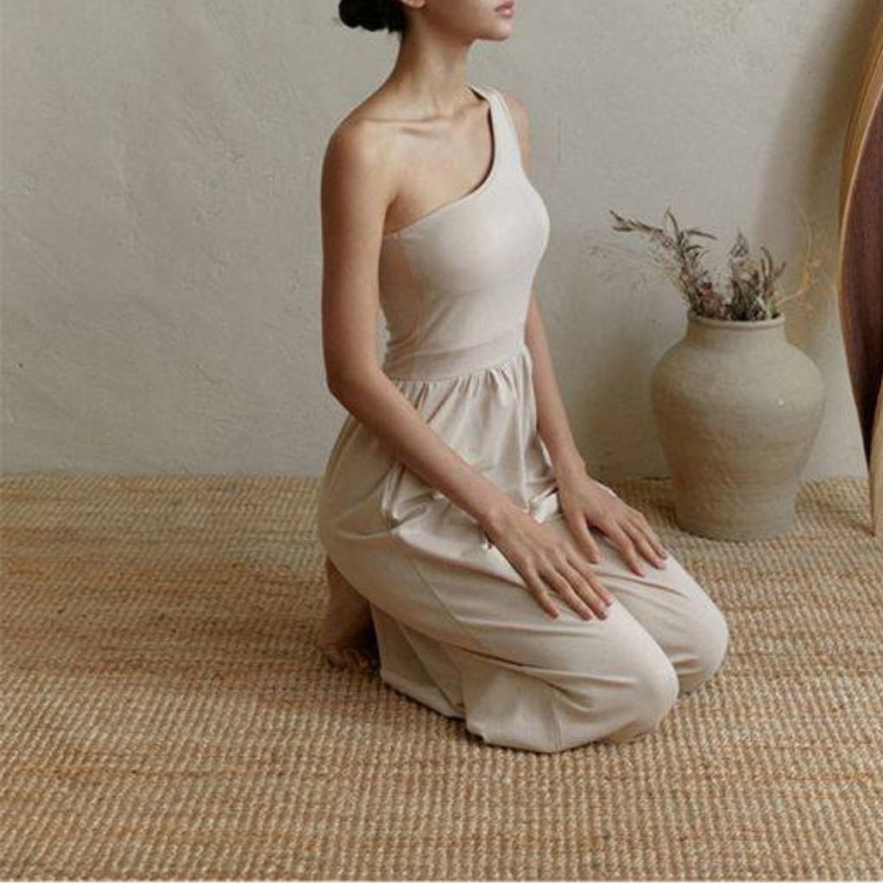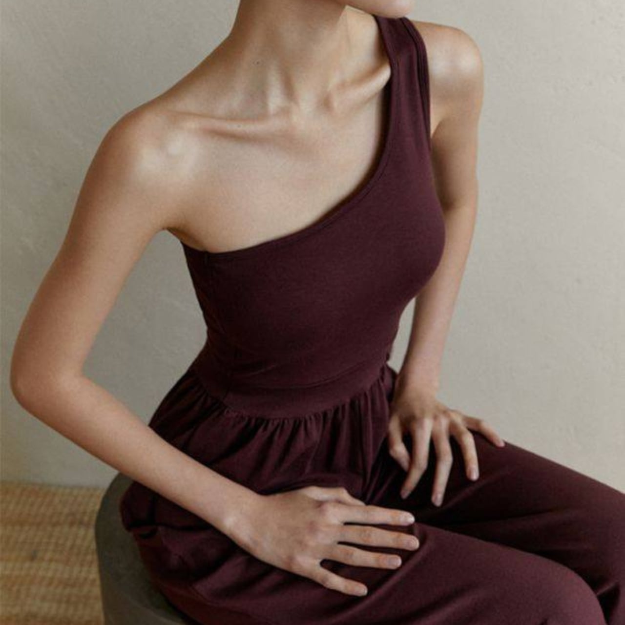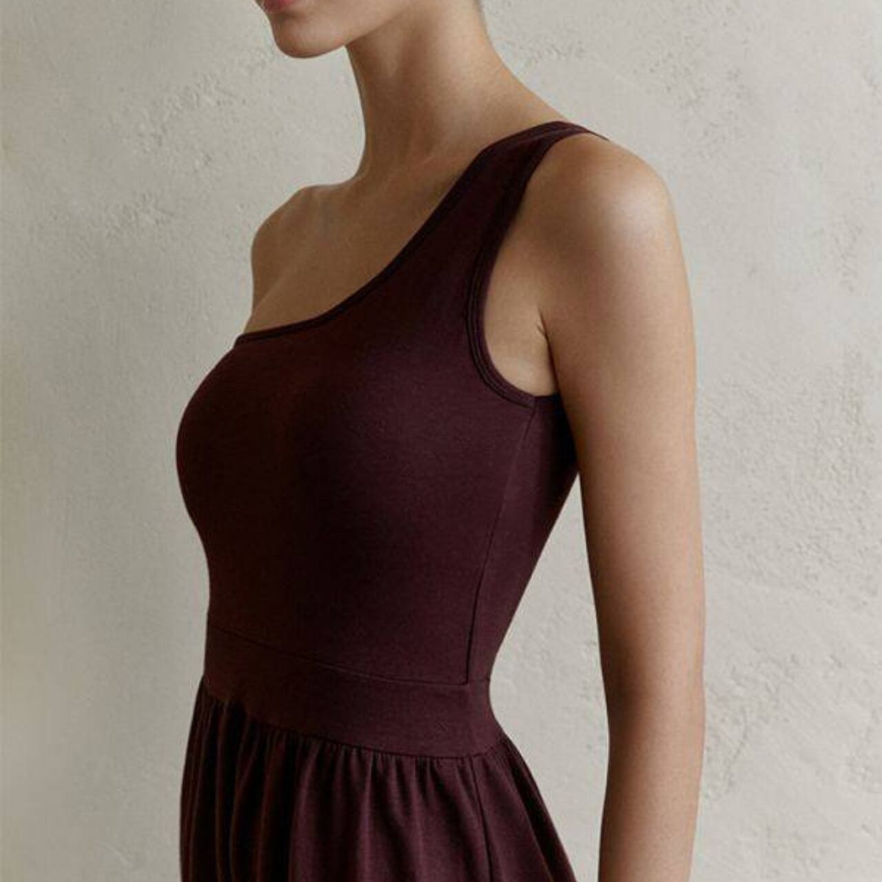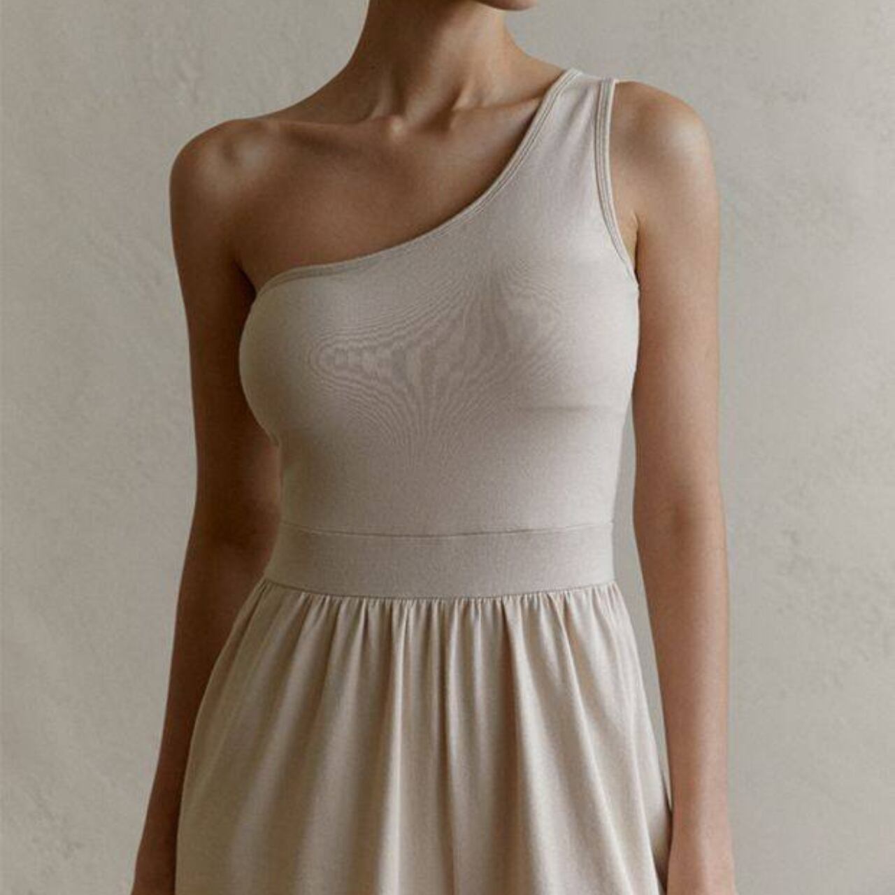 ワンショルダーのデザインは、肩周りを